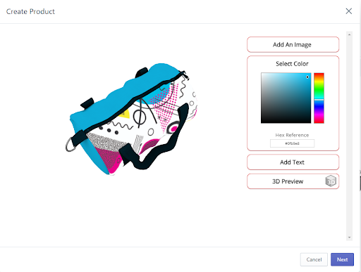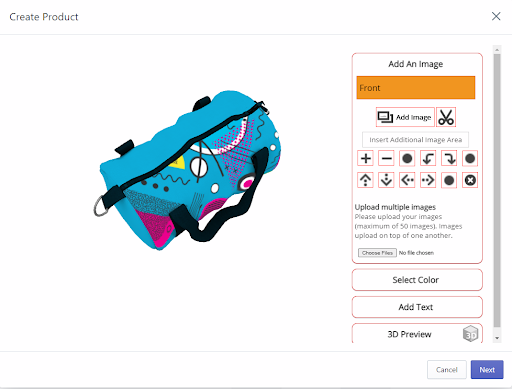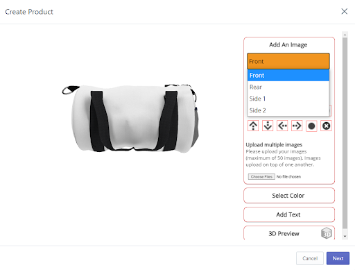 When the product loads, underneath Add Image there will be an orange drop-down menu. This menu will allow you to select specific pieces of the product to customize. You can see here, our duffle bag – large has four distinct options, a front, a rear, and two different sides. First, we are going to add an image to the front of the duffle bag by clicking on the orange drop-down menu and selecting “front”. Once you’ve selected your side you can click on the Add Image prompt to upload an image. If you use a PNG image or the scissor tool to cut out a specific section of your image to make it transparent, when you move to the Select Color tool, it will fill in with the color selected.