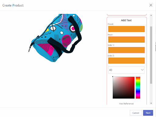 Once you’ve uploaded your image to the designer and have selected the color you’d wish to use, you can use our Add Text tool to pick the section of the product you want to add text to. Once you’ve expanded the Add Text option you’ll see orange text boxes for each side the product offers to customize. Just type in whatever text you want, where you want it, and use the drop-down menu to select font, size, and text color, and rotation options to finish customizing your product and click on the next button